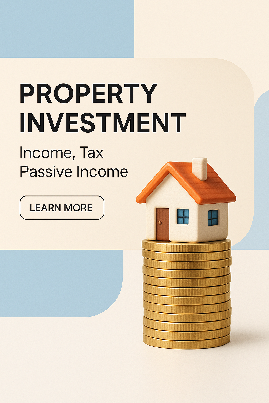 A stylized mini house sits atop a stack of coins, representing property investment. The background features soft geometric shapes, with bold typography highlighting key concepts of income and taxes.