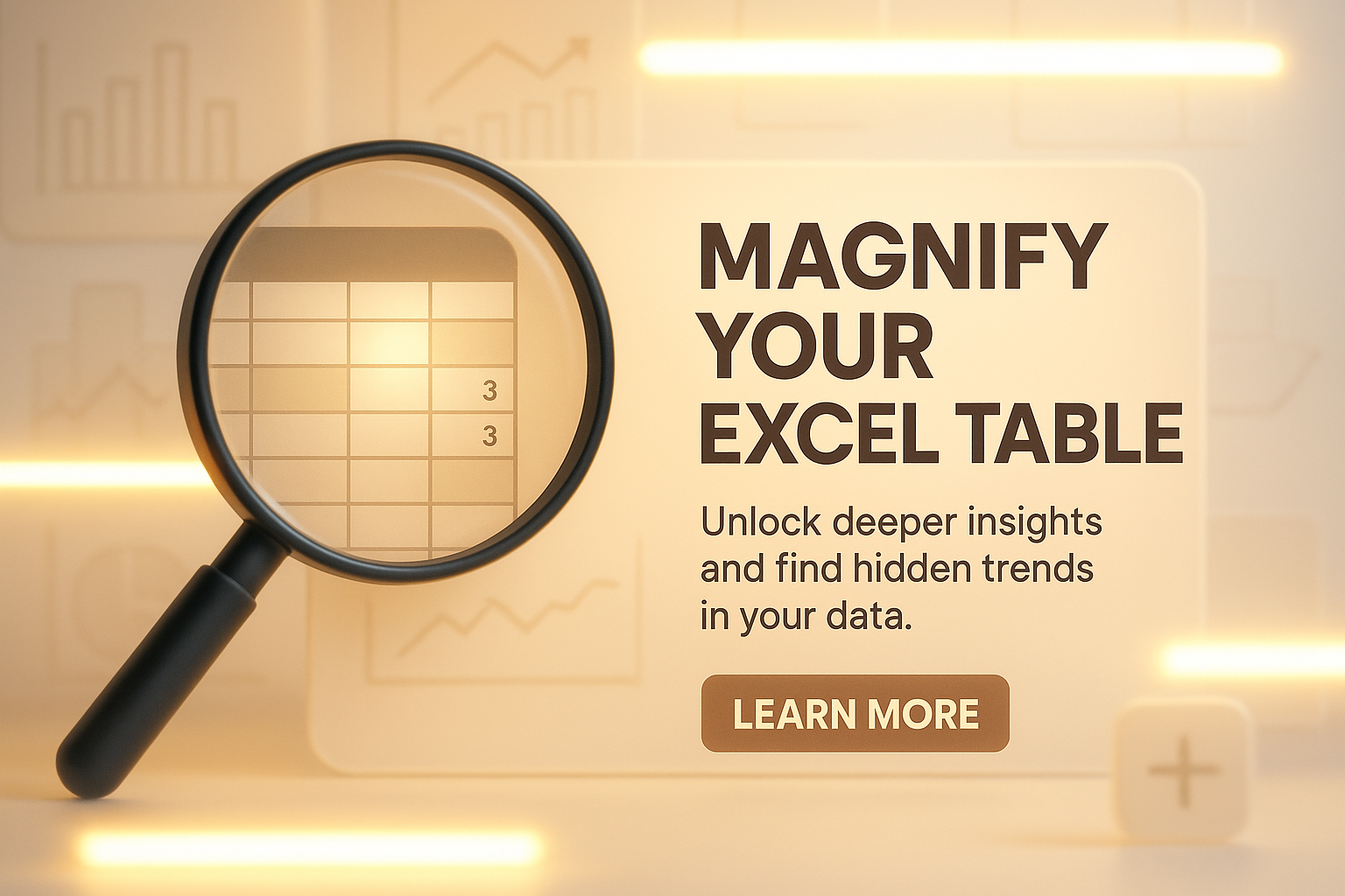 Engaging promotional graphic featuring a magnifying glass over an Excel table, designed to highlight data analysis features. Ideal for marketing analytics tools and software.