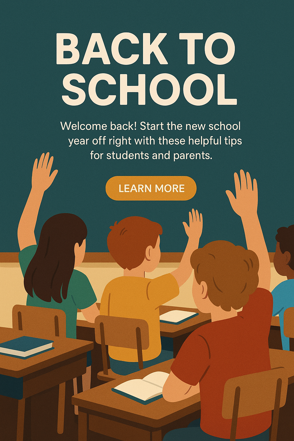 /Collection: /by davooda/Type: PNG/Illustrative image aimed at promoting back-to-school tips, featuring students raising hands in a classroom setting. Ideal for educational websites or social media.