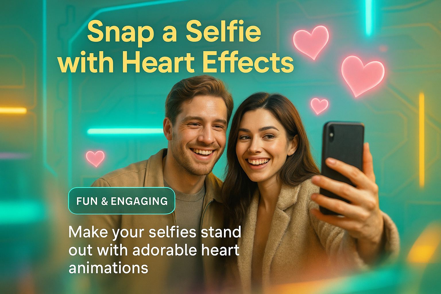 /Collection: /by davooda/Type: PNG/Vibrant social media graphic encouraging users to take selfies with heart animations. Features a cheerful couple, appealing colors, and playful design elements, ideal for engaging an audience on platforms like Instagram.