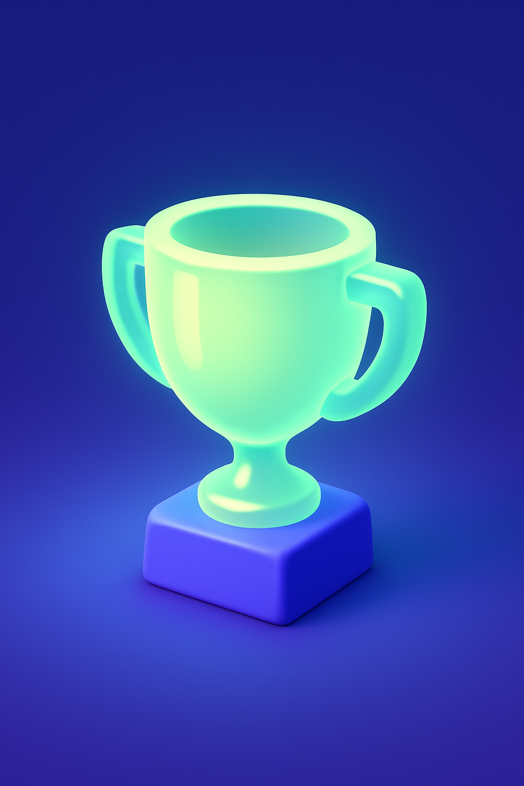 A simple 3D trophy icon featuring a glowing light yellow-green cup atop a solid blue base. The composition emphasizes shadows and a soft glow, illuminating the scene in cool shades.