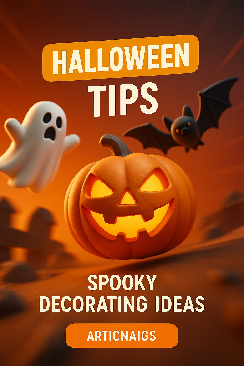 A vibrant Halloween-themed graphic featuring a carved pumpkin, ghost, and bat, designed to showcase decorating ideas. Ideal for social media and event promotions.