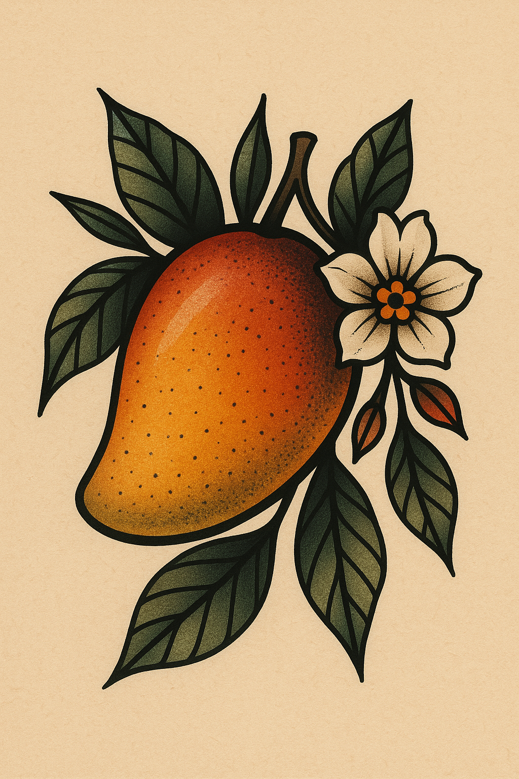 This image features a stylized mango surrounded by leaves and a flower, showcasing a vibrant, illustrative design. Ideal for food-related content or decor.