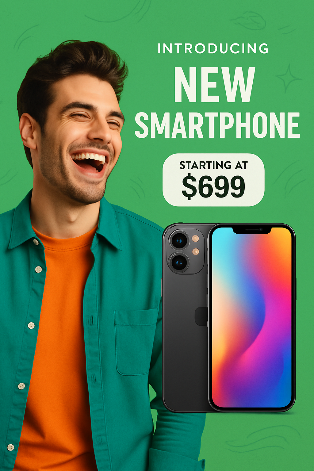 /Collection: /by davooda/Type: PNG/A vibrant advertisement showcasing a smiling man in bright clothing against a green background, alongside a sleek smartphone. The layout features bold typography and a price tag, creating an energetic appeal.