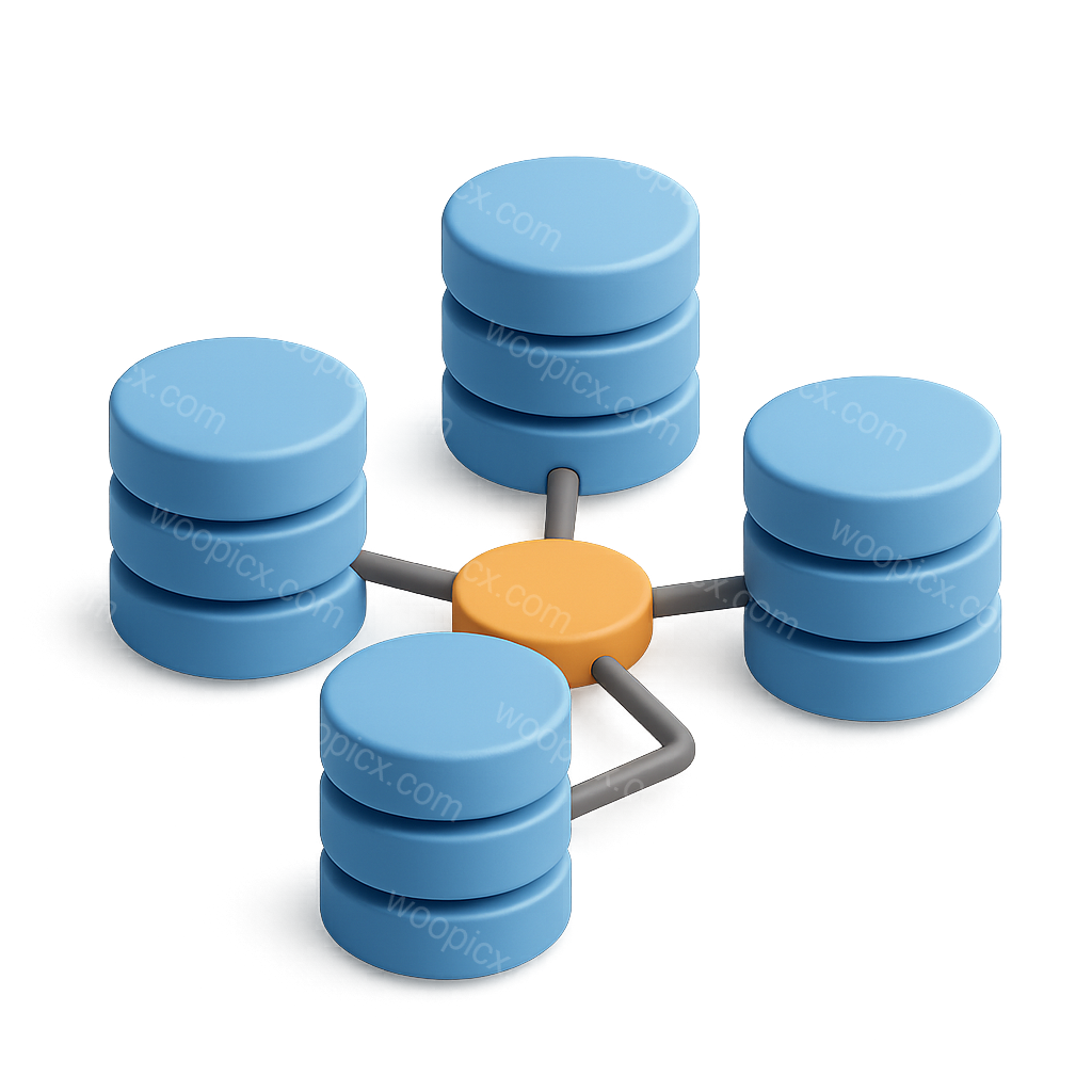 A visually striking 3D icon depicting a distributed storage system. It features four cylindrical blue data storage units connected by a central orange hub, all rendered in an isometric and volumetric style.