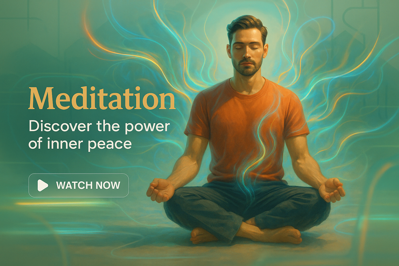 A visually striking promotional graphic illustrating a man meditating, surrounded by ethereal energy. Perfect for wellness or mindfulness campaigns.