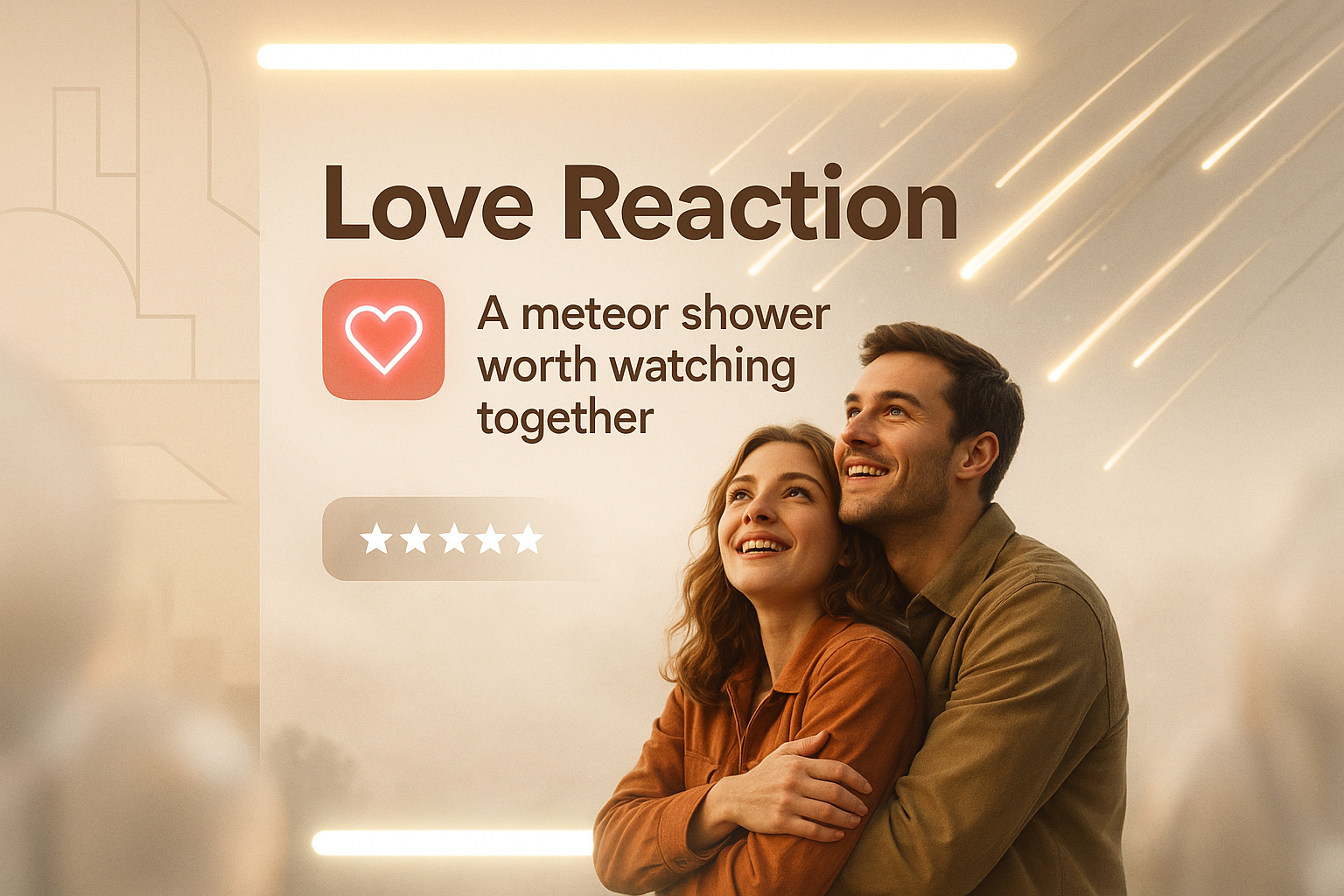 Engaging social media graphic featuring a couple enjoying a meteor shower, perfect for promoting romantic events or experiences. The design blends warm tones with modern typography.