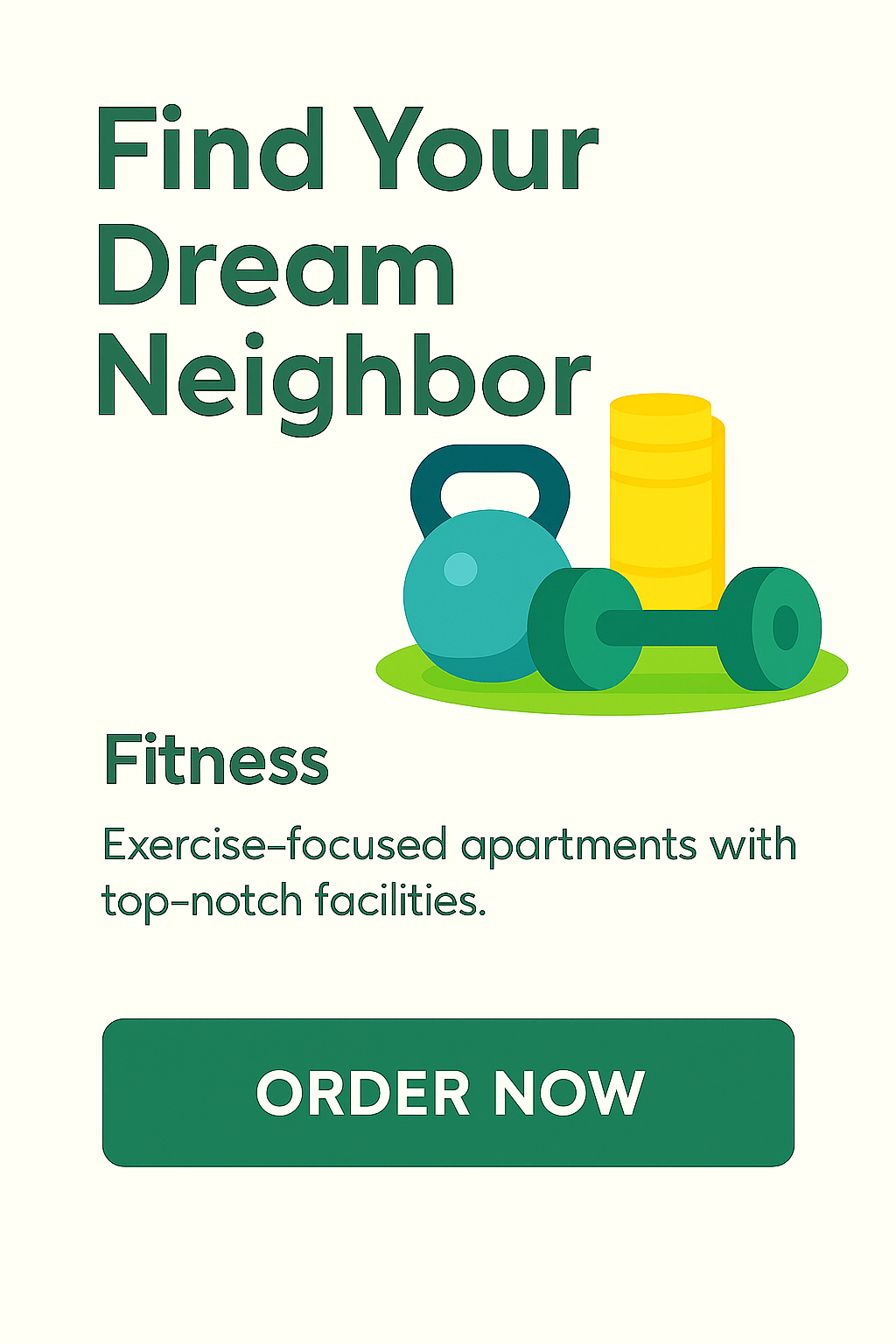 /Collection: /by davooda/Type: PNG/A promotional graphic highlighting fitness-focused apartments featuring exercise equipment illustrations. The design is modern and appealing, aimed at potential renters interested in wellness.