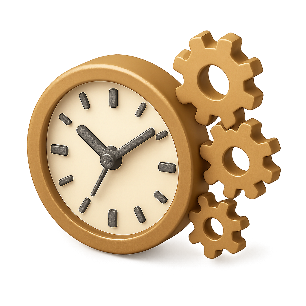 A stylized 3D illustration of a clock with mechanical gears. The clock features a golden frame and a cream-colored face, viewed from a three-quarter angle with a volumetric feel.