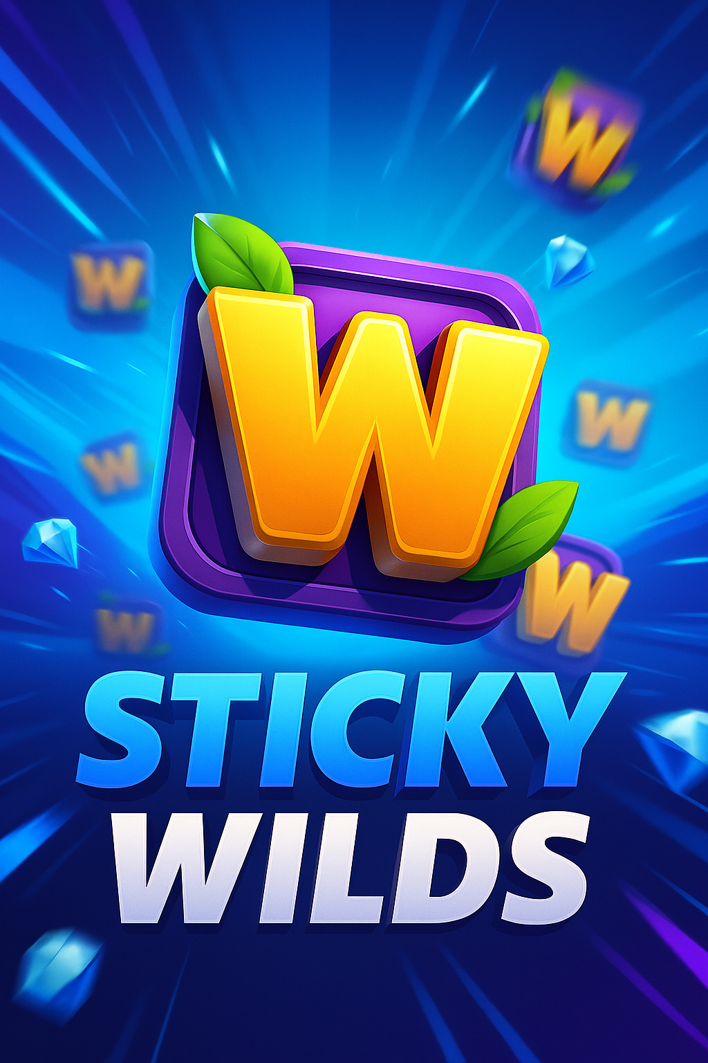 A vibrant and dynamic graphic featuring the title 'STICKY WILDS' with a 3D effect. The design uses bold colors and layered elements that create a sense of motion and excitement.