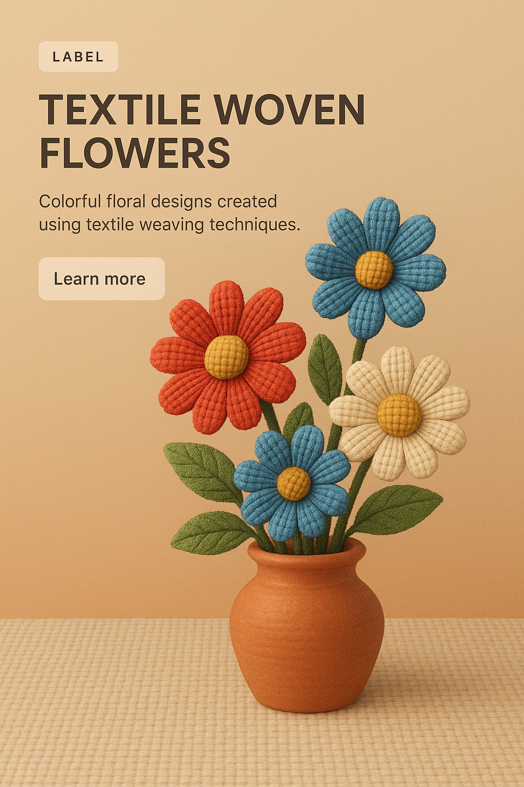 A vibrant 3D illustration of textile woven flowers in a pot, featuring colorful blooms and a text label. The design is zoomed out to emphasize the entire composition.