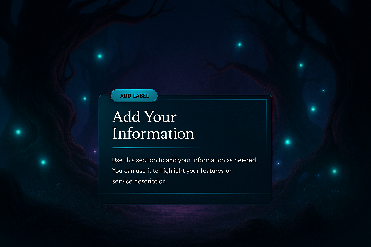 /Collection: /by davooda/Type: PNG/A mesmerizing forest scene at night, featuring glowing lights among dark trees. The design includes a labeled information block seamlessly integrated into the image.
