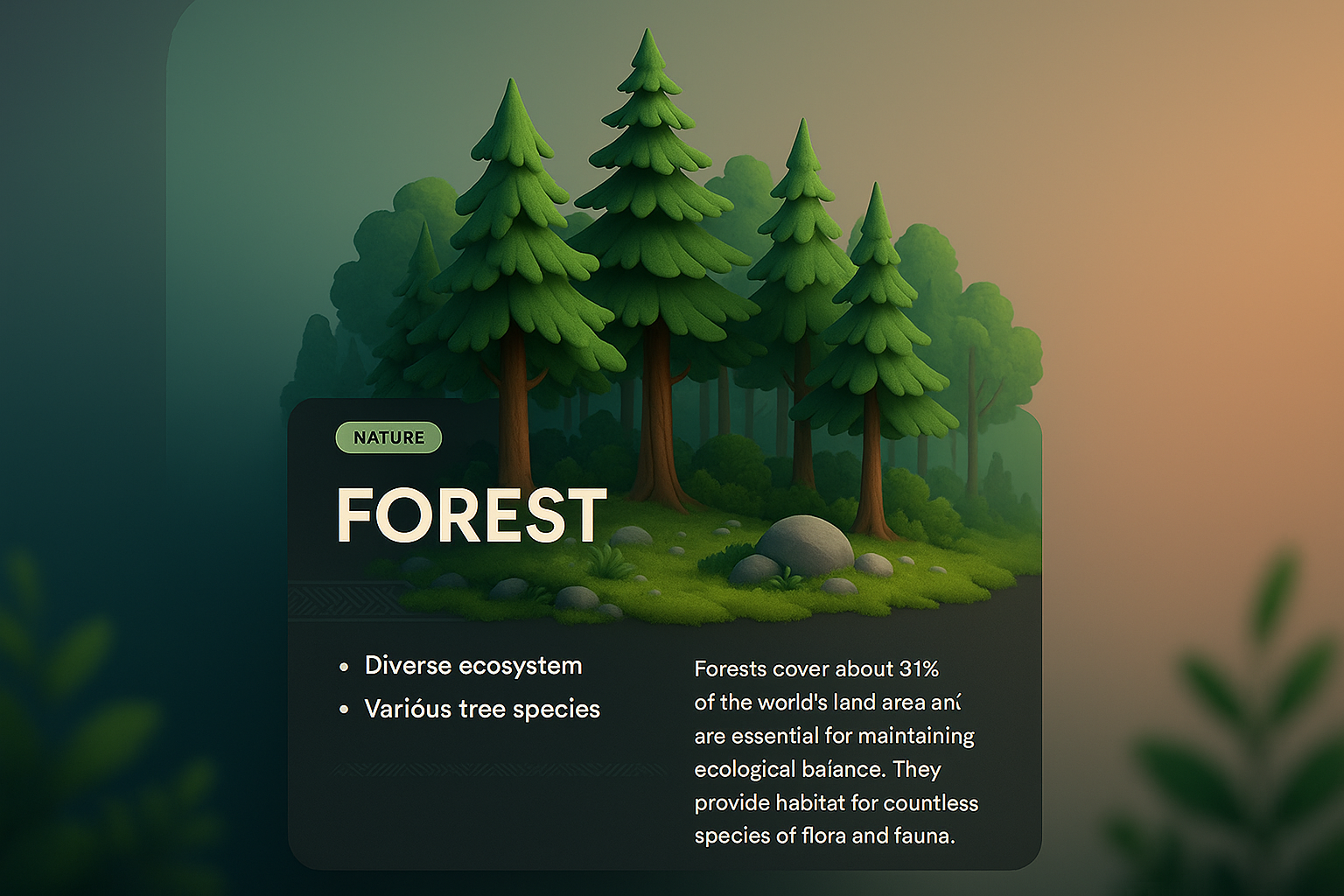 /Collection: /by davooda/Type: PNG/A captivating 3D illustration of a forest featuring tall trees and rocks, complemented by a dark design panel that integrates seamlessly with the scene. The layout includes informative text about the forest's ecosystem.