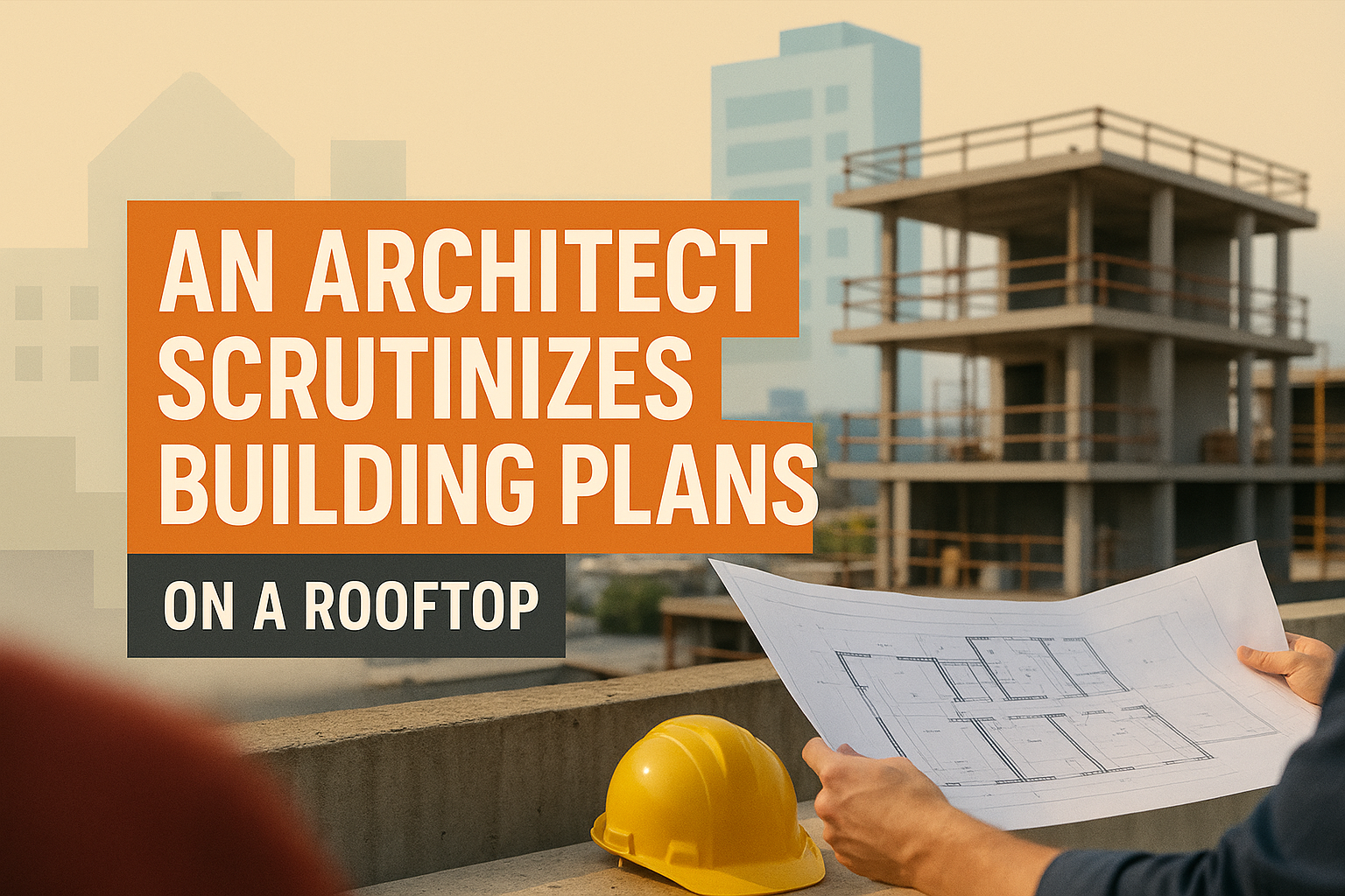 Professional image of an architect analyzing building plans on a construction site rooftop. The visual emphasizes planning and project management in architecture.