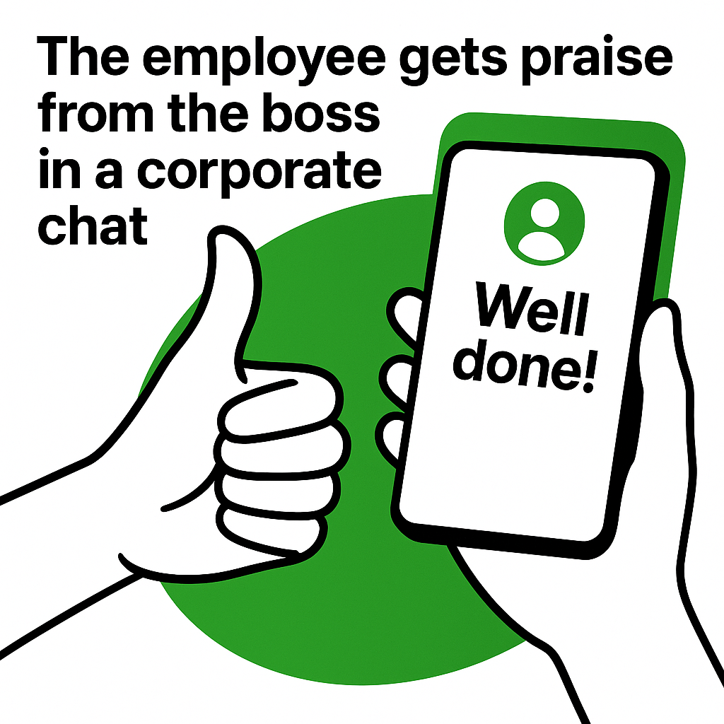/Collection: /by davooda/Type: PNG/A modern graphic depicting an employee receiving praise from a boss via a smartphone, featuring bold lines and a minimalistic design. Ideal for corporate communications or motivational materials.