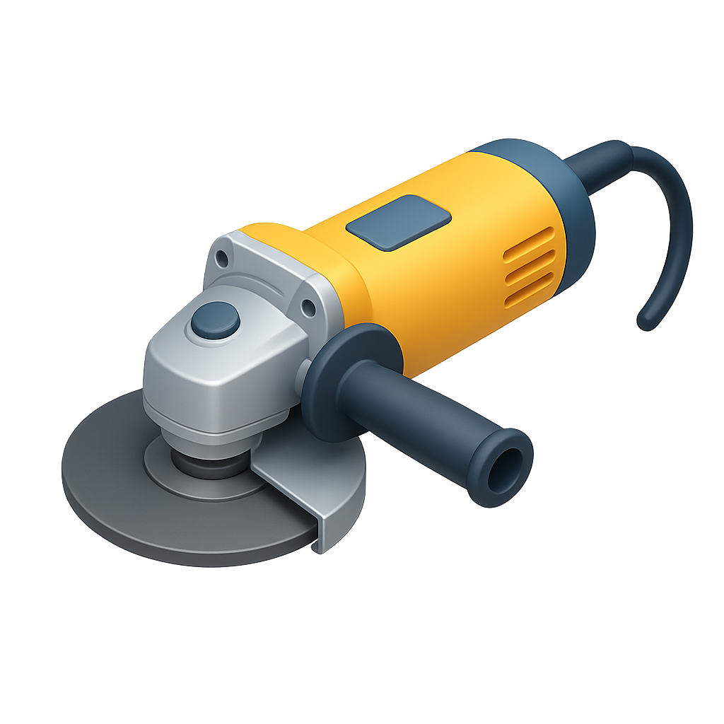 /Collection: /by davooda/Type: PNG/A sleek 3D icon of an angle grinder viewed from a three-quarter angle, featuring a yellow body, gray handle, and a spinning disc, all set against a transparent background.
