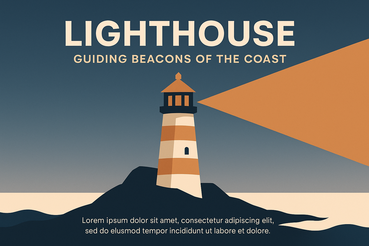 /Collection: /by davooda/Type: PNG/A beautifully designed lighthouse set against a gradient sky. The lighthouse, featuring a striped pattern, stands on a rocky shore, with a beam of light projecting outward. It combines geometric shapes with a balanced color scheme.