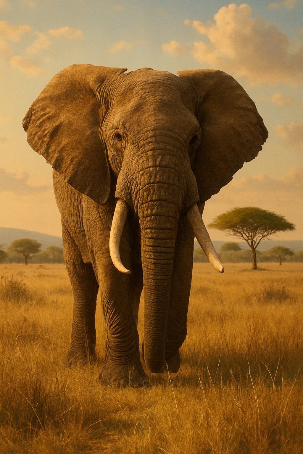 Stunning portrait of a majestic African elephant standing in a golden savanna. The warm lighting and serene background create an inviting atmosphere, ideal for wildlife conservation themes.