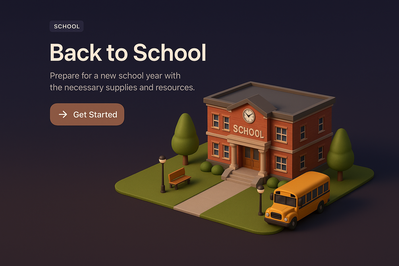 A detailed 3D illustration of a school building with a school bus, set against a dark gradient background, emphasizing a 'Back to School' theme with clear text elements.