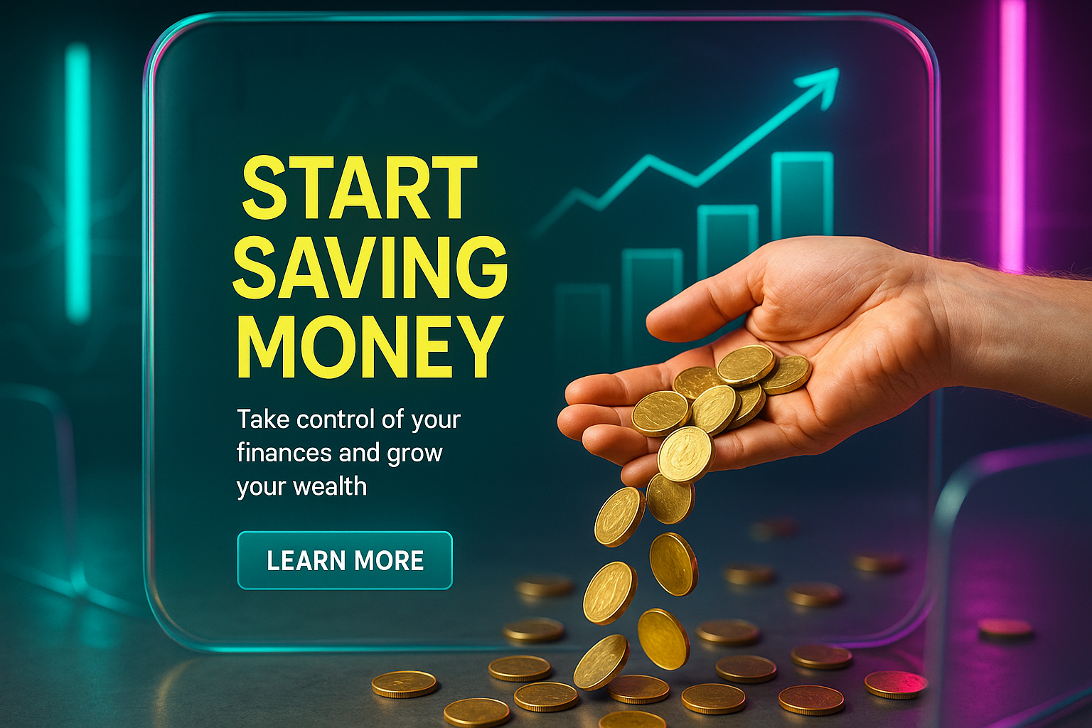 /Collection: /by davooda/Type: PNG/Engaging promotional graphic encouraging financial savings, featuring a hand pouring coins against a striking background with upward trend lines, ideal for financial services marketing.