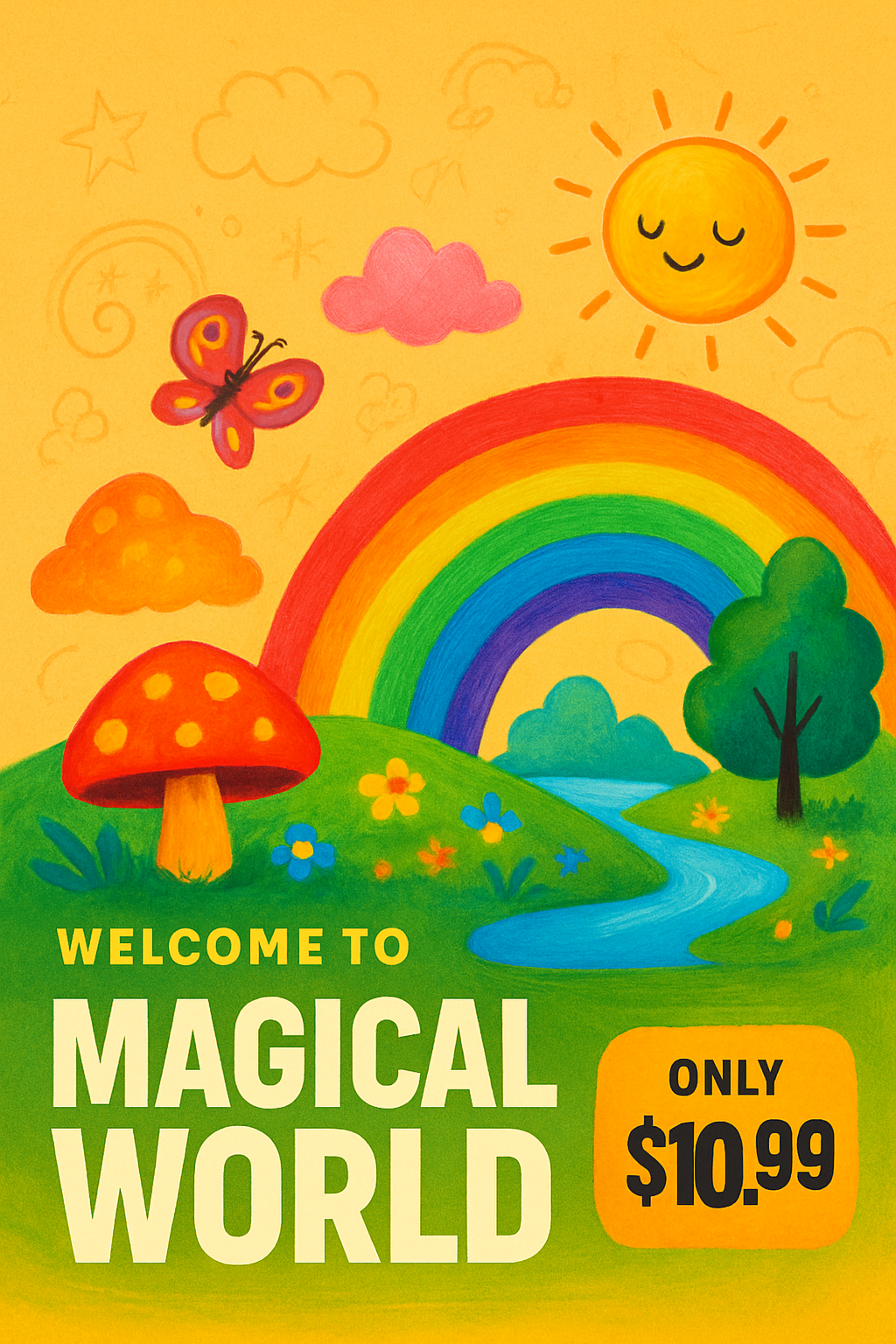 /Collection: /by davooda/Type: PNG/A colorful advertisement featuring a whimsical landscape with a rainbow, sun, and butterfly. Bold typography highlights the offer for a magical experience, creating an energetic vibe.