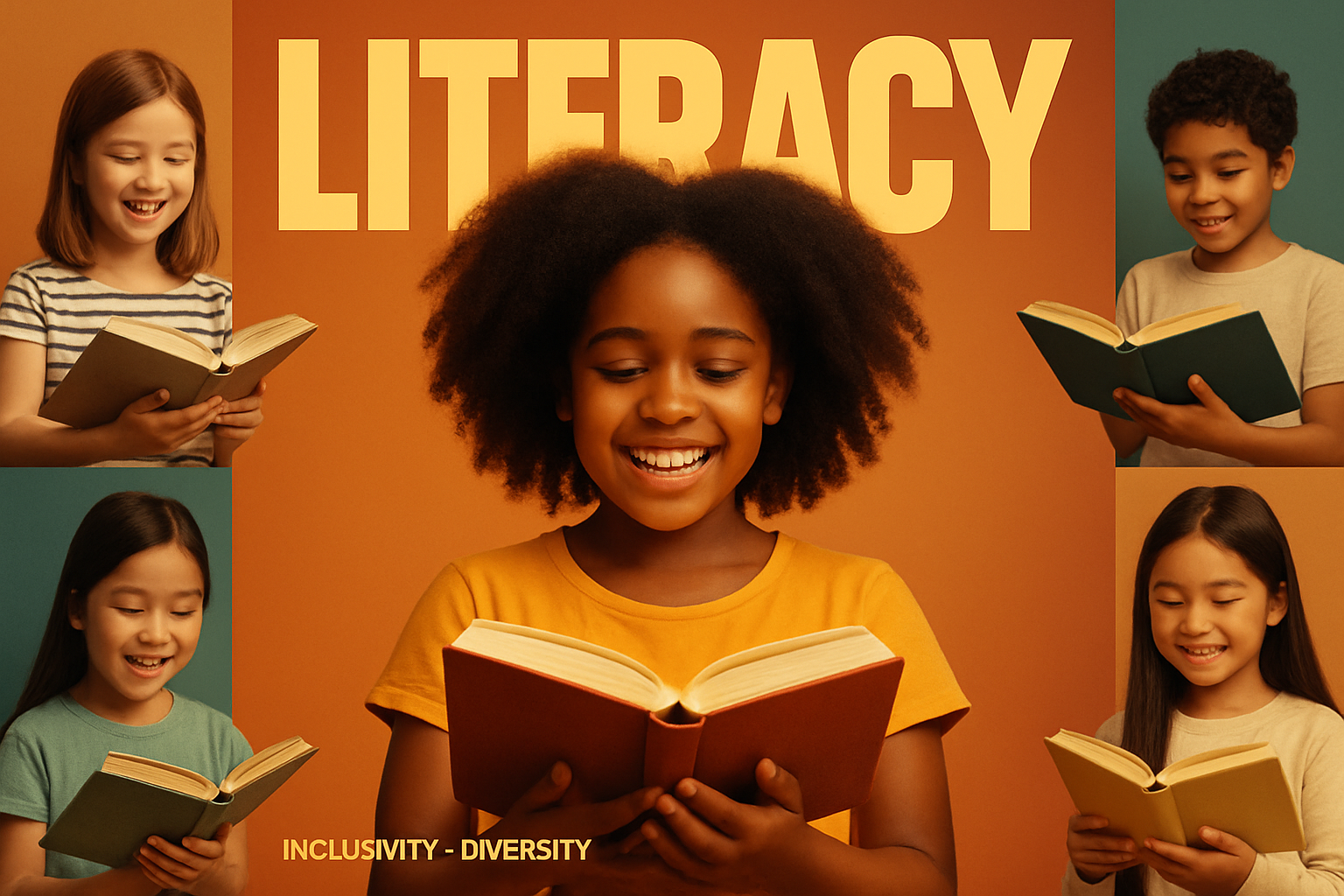 Diverse Kids Embracing Literacy in Bold Colorful Design