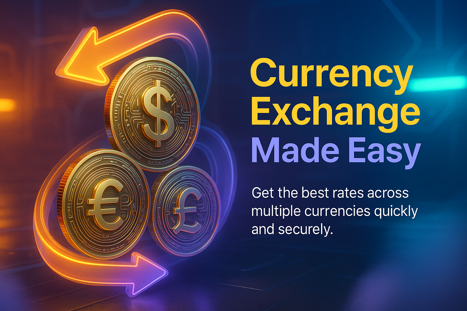 Currency Management Promotional Graphic Featuring Coins and Exchange Arrows