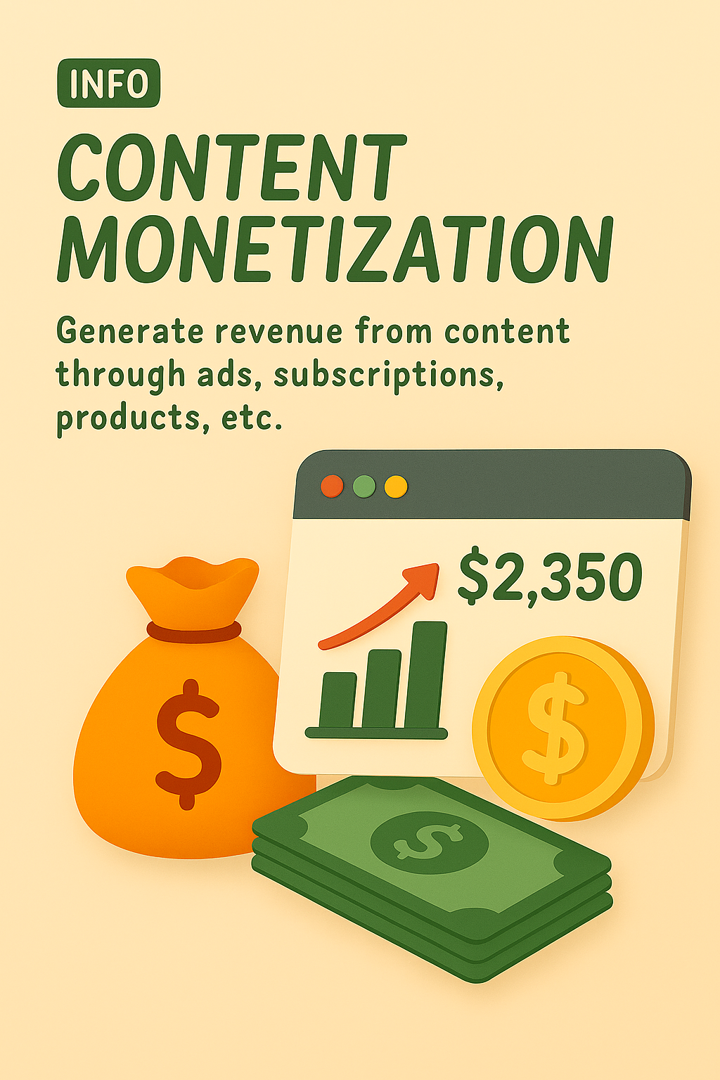 Colorful infographic illustrating content monetization techniques with visuals of money and growth, aimed at content creators and marketers.