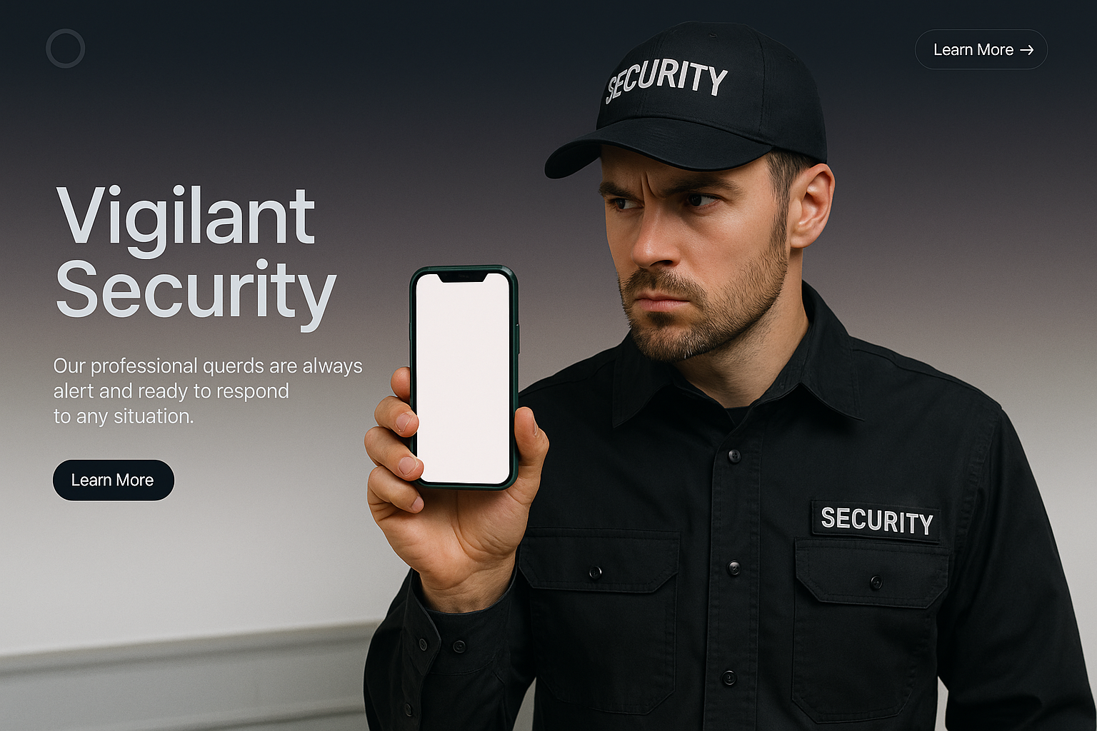 A vigilant security guard in a black uniform holds a green phone, displaying a blank screen. The background features a gradient from dark to light, creating a professional atmosphere.