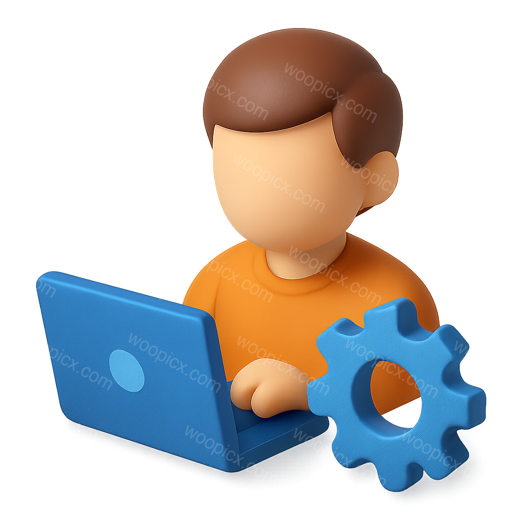 3D Icon of a Tech Worker Engaged with Laptop and Gear