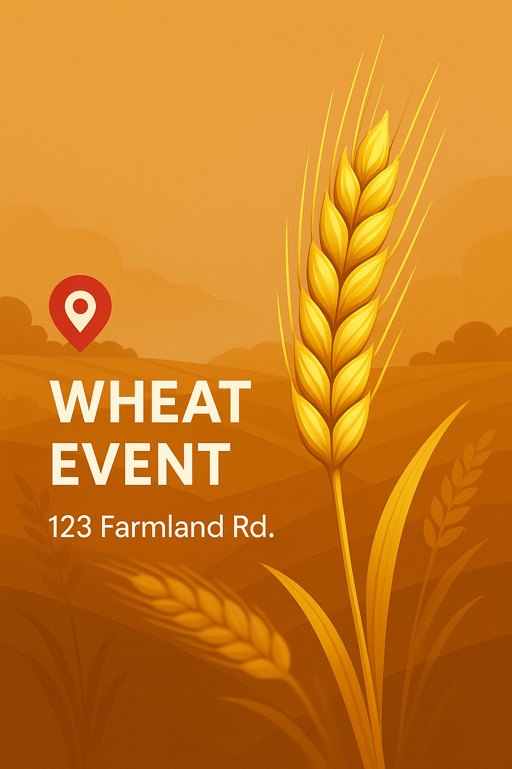 Vibrant promotional graphic for a wheat-themed event, showcasing stylized wheat stalks against a warm orange background. Ideal for agricultural events or community gatherings.