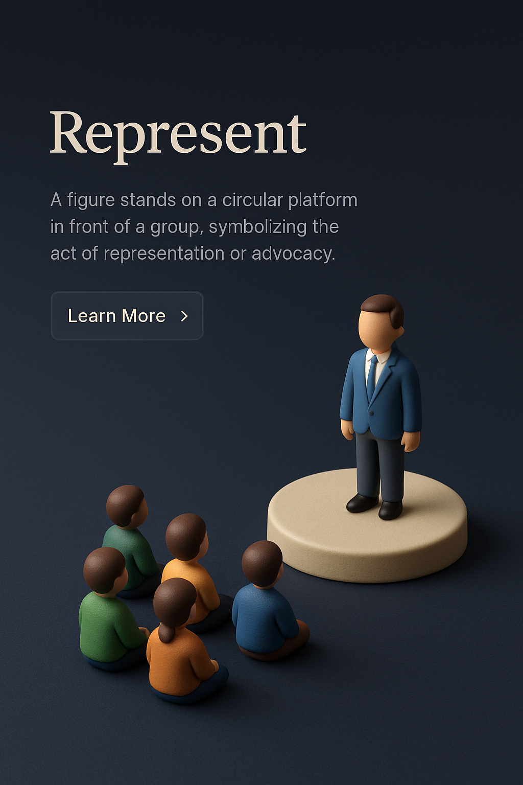 A 3D scene featuring a figure on a circular platform with an audience below. The dark gradient background enhances the visual appeal of the representation theme.