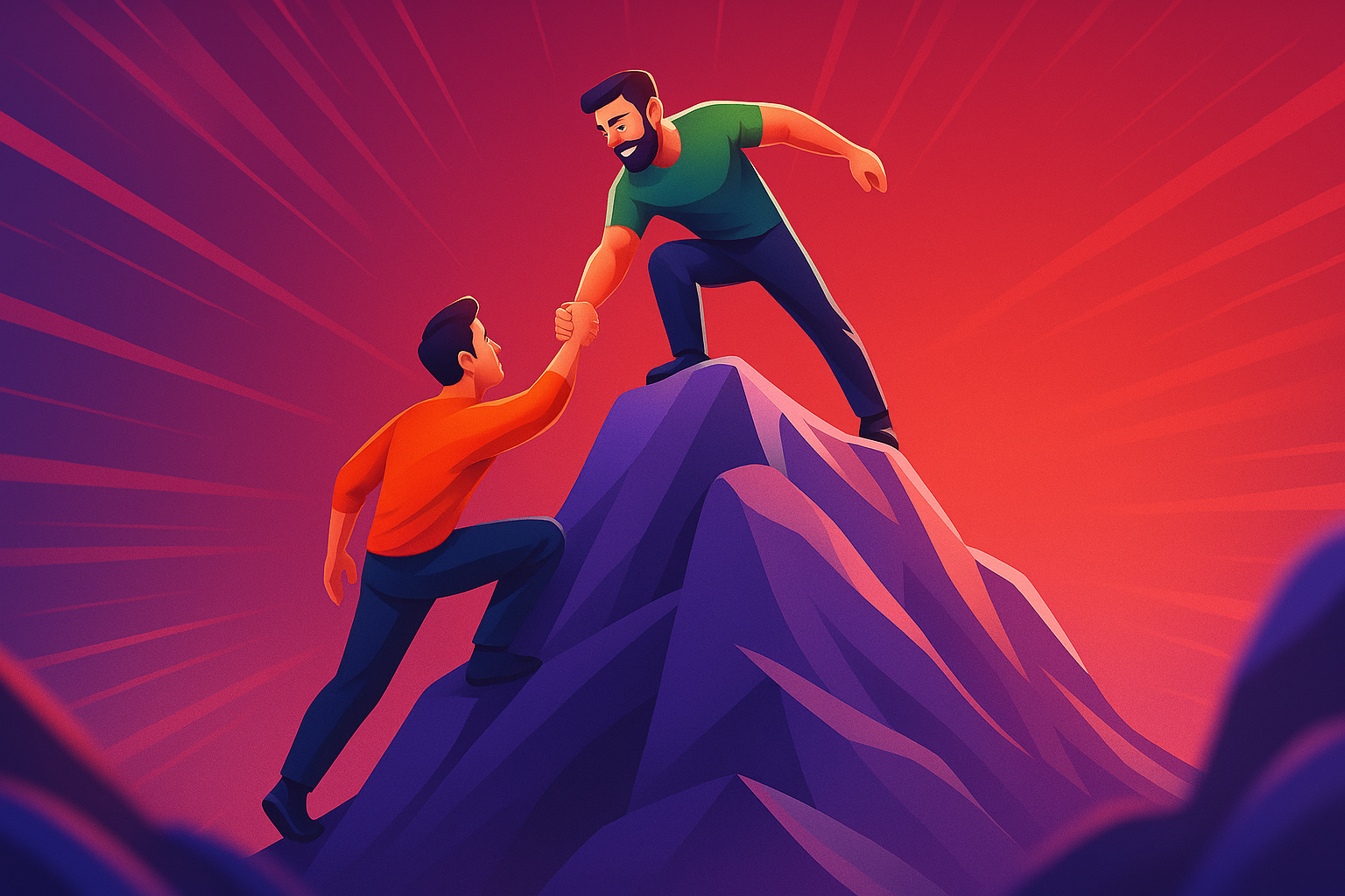 /Collection: /by davooda/Type: PNG/An engaging illustration depicting two men in a dynamic mountain climbing scene, showcasing teamwork and support as one helps the other reach the summit against a vibrant gradient background.