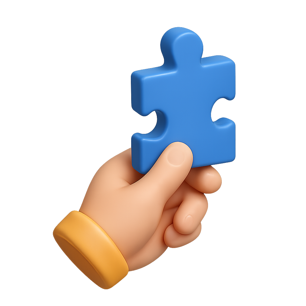A vibrant 3D puzzle piece held in a hand, showcasing a glossy blue finish. The hand is designed with a yellow sleeve, adding warmth to the image. The background features a soft gradient, enhancing the 3D feel.