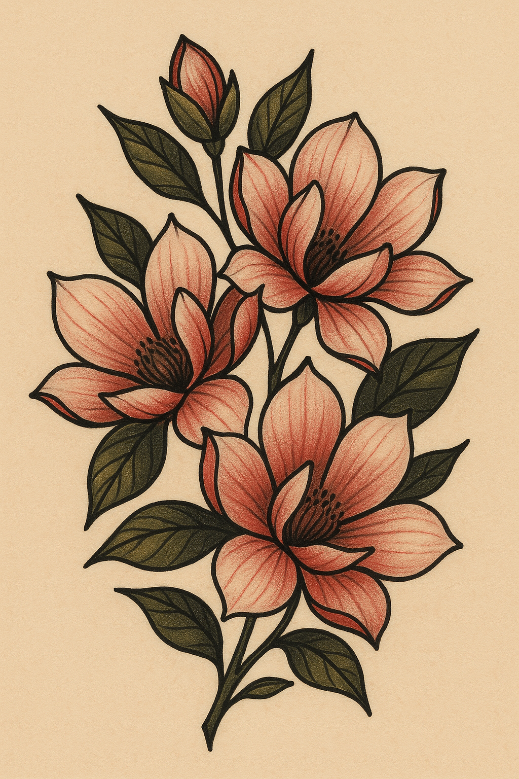 A detailed illustration of magnolia flowers with soft pink petals and green leaves. The design is suitable for decorative purposes, art prints, or botanical themes.