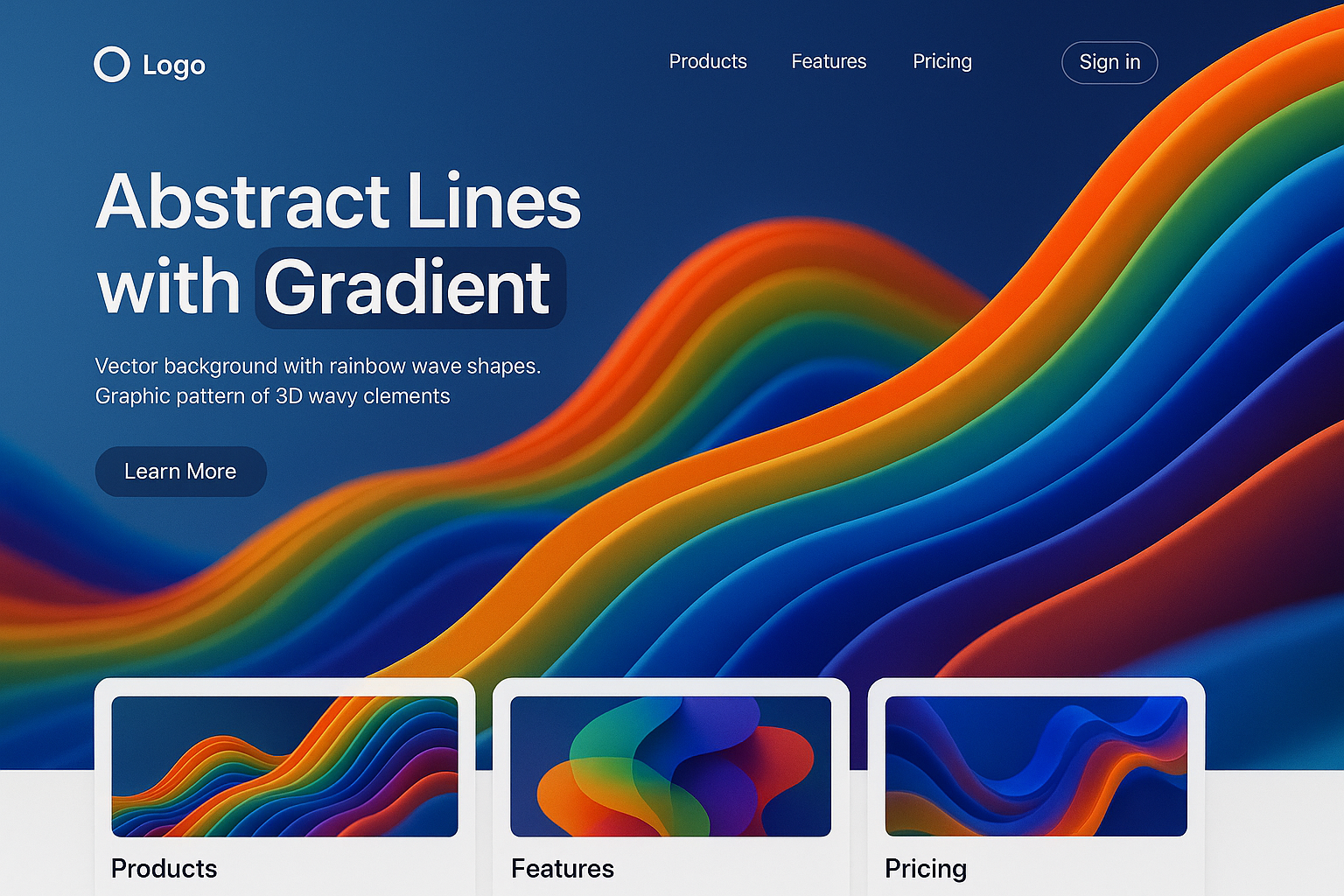 /Collection: /by davooda/Type: PNG/A visually engaging landing page featuring abstract lines with a color gradient. Includes sections for products, features, and pricing with a clean design and readable text.