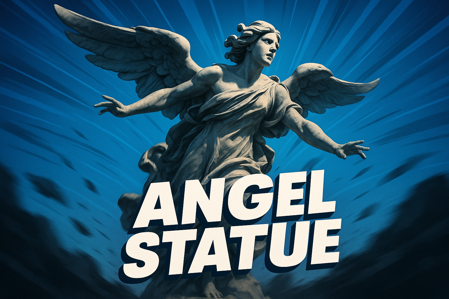 A striking 3D illustration of an angel statue, captured from a dynamic angle. The statue is surrounded by dramatic rays emanating from the center, enhancing its motion and presence.