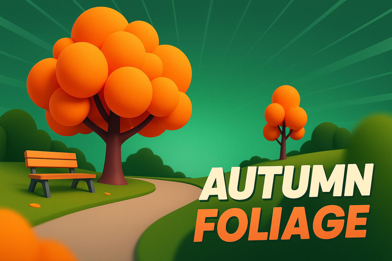 A dynamic 3D illustration showcasing vibrant autumn foliage in a park. The scene features orange trees, a winding path, and a bench, all set against a smooth gradient background.