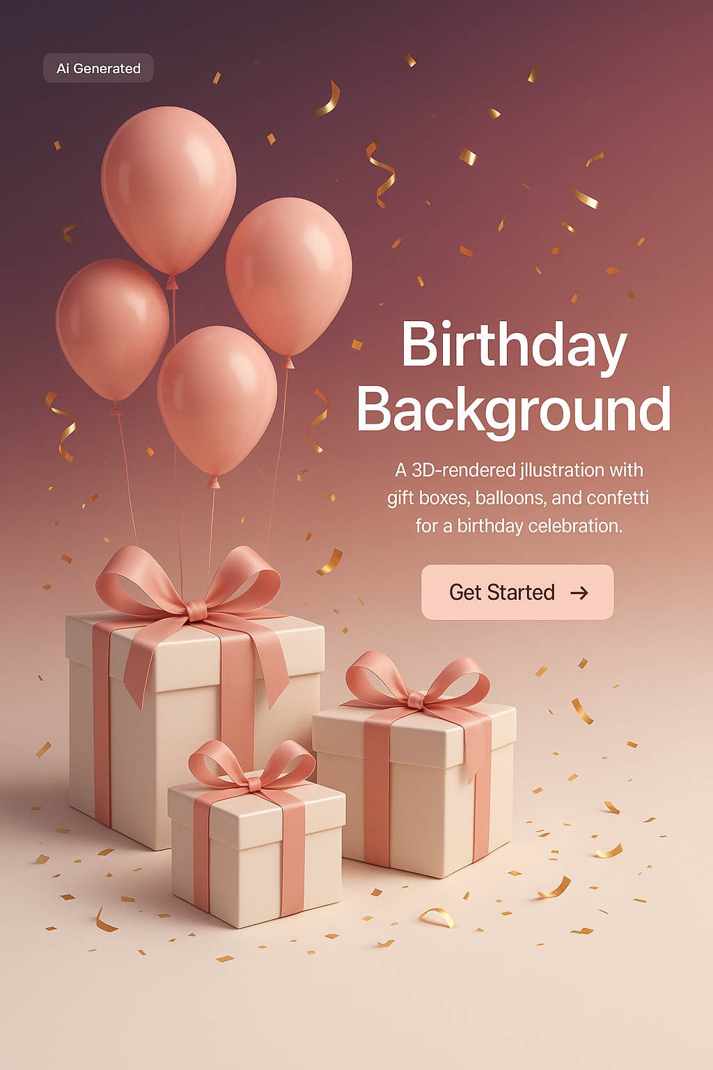 /Collection: /by davooda/Type: PNG/A visually striking 3D rendering featuring gift boxes adorned with pink ribbons, floating pink balloons, and scattered confetti, perfect for birthday celebrations.