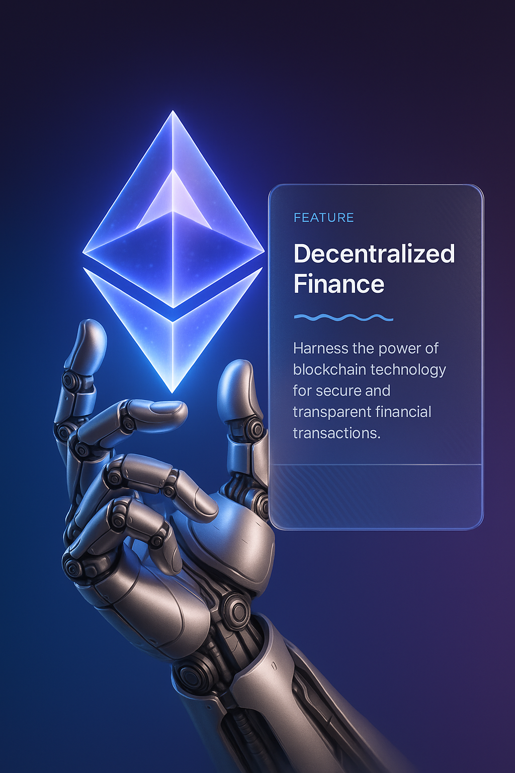 /Collection: /by davooda/Type: PNG/A futuristic robotic hand delicately holds a glowing Ethereum crystal. Accompanying the hand is a feature block highlighting decentralized finance, showcasing modern blockchain technology.