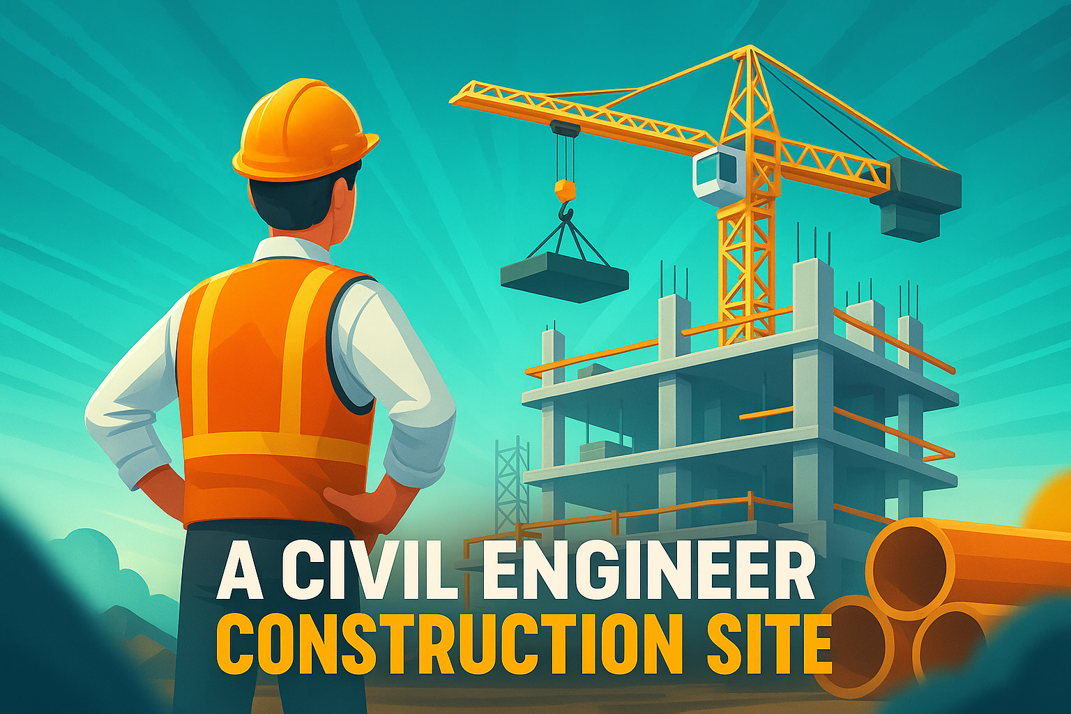 /Collection: /by davooda/Type: PNG/A civil engineer observes a bustling construction site, with cranes and building materials prominently displayed. The dynamic scene showcases the energy of construction.