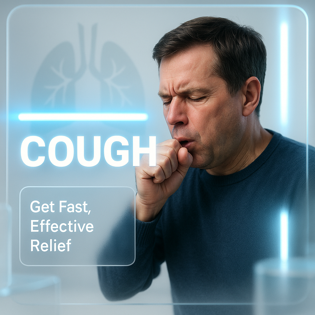 Informative health-themed graphic highlighting cough relief solutions, designed with modern visuals and clear messaging for healthcare marketing.