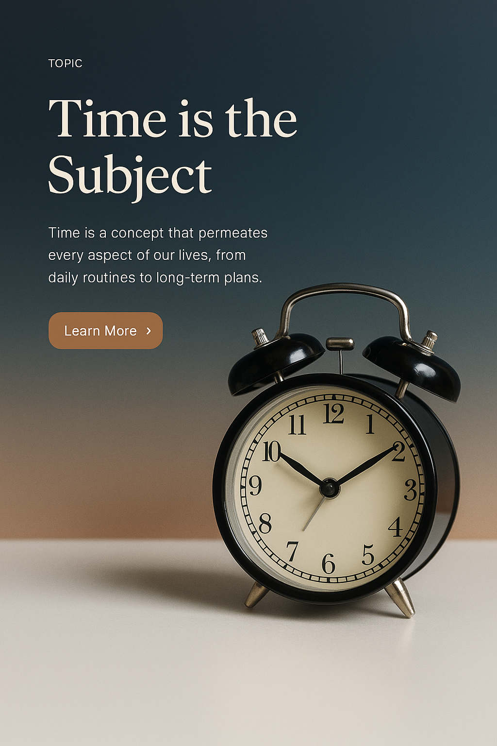 An elegant visual composition featuring a vintage alarm clock against a gradient background, emphasizing the theme of time. The design includes a clear title and a call-to-action button.