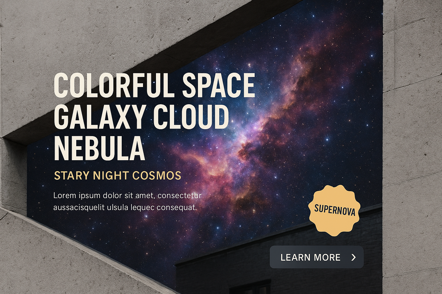 This image features a colorful space nebula set against a modern architectural backdrop. The cosmic scene blends with design elements, creating a striking contrast.