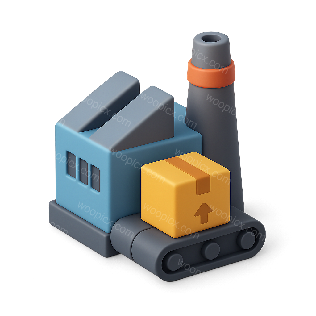 /Premium/Collection: /by davooda/A stylized 3D icon depicting a production facility with a blue structure, a yellow box on a conveyor belt, and a smokestack. It features an isometric and volumetric design.