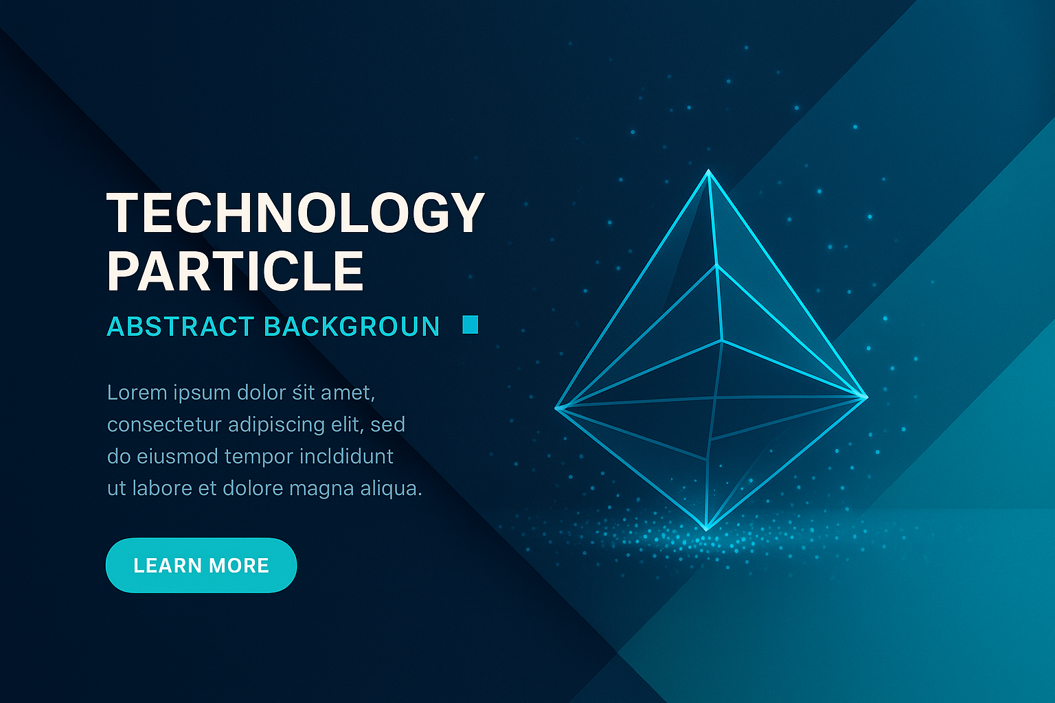 A modern abstract background featuring a geometric shape at the center, complemented by a three-color scheme. The design includes a main headline and a secondary subtitle, along with a call-to-action button.