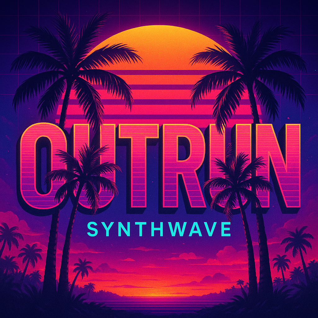 This digital artwork captures the essence of the synthwave genre with bold typography and vibrant colors, featuring palm trees and a sunset. It's ideal for music album covers or retro-themed events.