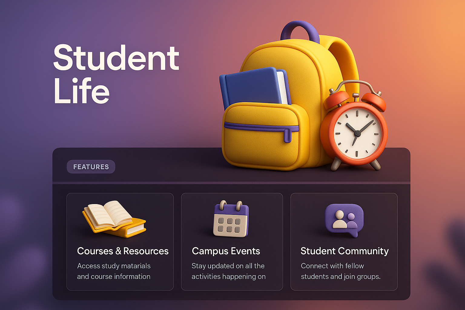 /Collection: /by davooda/Type: PNG/A vibrant 3D illustration showcasing student life elements, including a backpack, books, and a clock. The design features a dark panel with sections highlighting courses, events, and community.