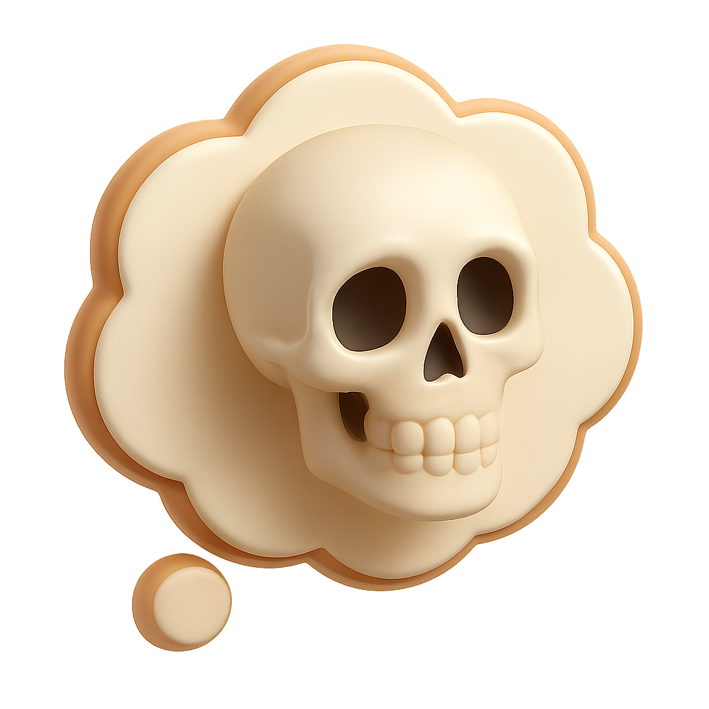 A stylized 3D skull enclosed within a thought bubble, showcasing a smooth, isometric design with a soft color palette. The skull features prominent eye sockets and a cheerful grin.