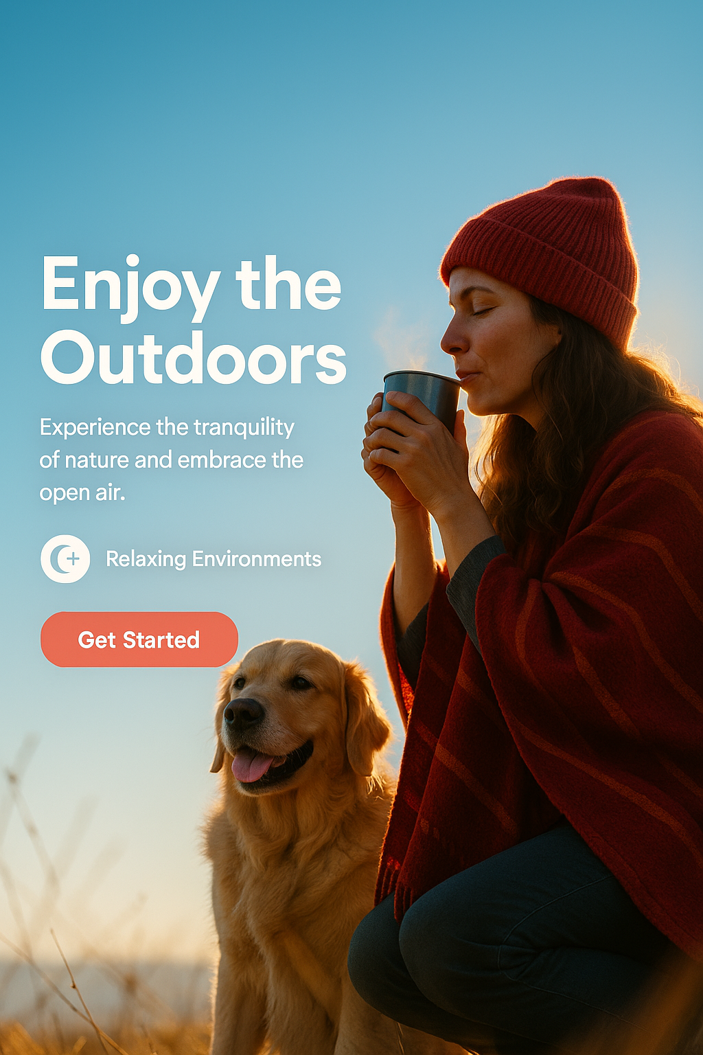 This is a promotional social media post showcasing a woman enjoying the outdoors with a dog, conveying tranquility and relaxation. Ideal for outdoor lifestyle brands.